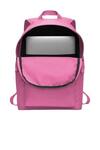 This pack combines simplicity and functionality with its clean design. Padded shoulder straps add an extra element of comfort while you carry your gear. 100% polyester Densely woven polyester provides heavyweight support A zippered main compartment offers room for gear Padded back panel and padded, ergonomically shaped shoulder straps for comfortable carrying Interior sleeve stores a laptop up to 15 Zippered front pouch provides small-item storage A haul loop at the top gives an alternative carrying option Contrast welded Swoosh design trademark Laptop sleeve fits most 15' laptops Dimensions: 17'h x 12'w x 6'd; Approx. 1,224 cubic inches