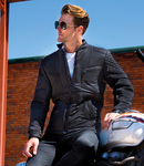 Polyester padding. 210T polyester lining. Quilted panels. Showerproof and windproof. Slim fit biker style. Stud closure collar and cuffs.