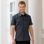 Modern fitted style with chest patch pockets with flap and button and fabric tab to fix rolled up sleeve. Semi-cut away, relaxed collar. Square edged adjustable cuff. Button on outer sleeve and fabric tab on inside of sleeve allow it to be rolled up and tabbed. Dye-to-match grosgrain patches on side seam hem. Dye-to-match grosgrain tape along neck seam. Rounded hem. Spare buttons.