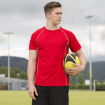 Coolplus® specially modified polyester fibres enable rapid absorption of sweat from skin surface. Contrast piping detail down front and back panels and along raglan seams. Raglan sleeves. Sports’ fit